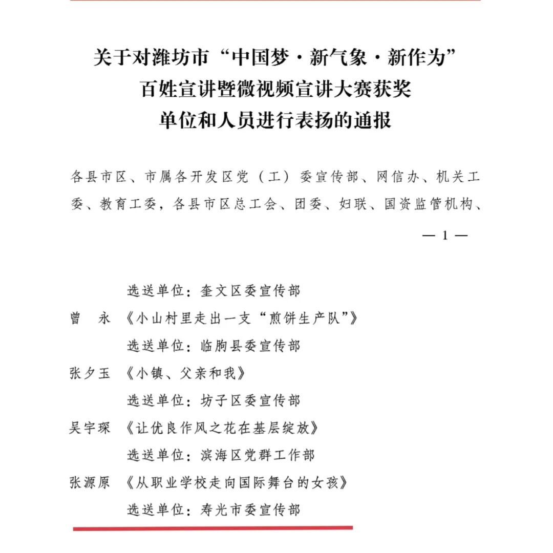 11月4日,潍坊市学习贯彻党的二十届三中全会精神暨“中国梦 新气象 新作为”百姓巡回宣讲启动仪式在首站寿光举行。宣讲中,我校张源原老师立足岗位实际,以《从职业学校走向国际舞台的女孩》为题,真情讲述了一名普通的职业学校女孩走向国际舞台的故事,生动阐释了一名党员教师的初心和使命。