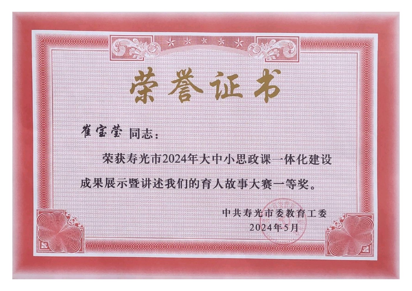 近日,寿光市委教育工委在世纪东城小学开展大中小学思政课一体化建设成果展示暨讲述我们的育人故事大赛活动,各教育学区、直属学校64名选手参赛。崔宝莹获评一等奖、张玉凤获二等奖。