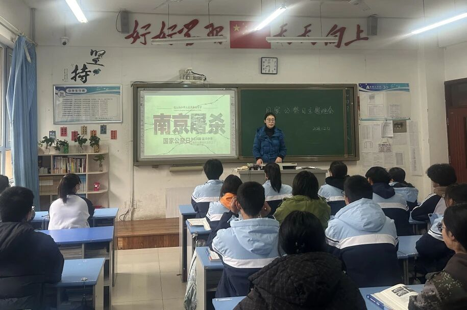 主题班会上,班主任通过课件、视频等方式,带领同学们重温历史,了解侵华日军在南京大屠杀的罪恶行径和国家公祭日设立的意义。同学们愤慨之余纷纷发言:一定要以史为鉴、面向未来,立报国志向,践强国之行。