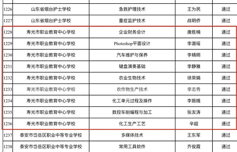 近日,山东省职业教育精品资源共享课程拟验收认定结果予以公示,潍坊渤海教育集团寿光职教中心校区唐胜楠、李潞瑶等教师主持的9门课程,全部通过省级验收认定。