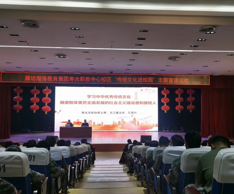为加强学校中华优秀传统文化教育,丰富校园生活,提升师生文化自信,近日,潍坊渤海教育集团寿光职教中心校区邀请寿光市政协原主席、关工委主任王茂兴到校作传统文化专题宣讲。学校领导班子及2024级师生共计800余人参加活动。