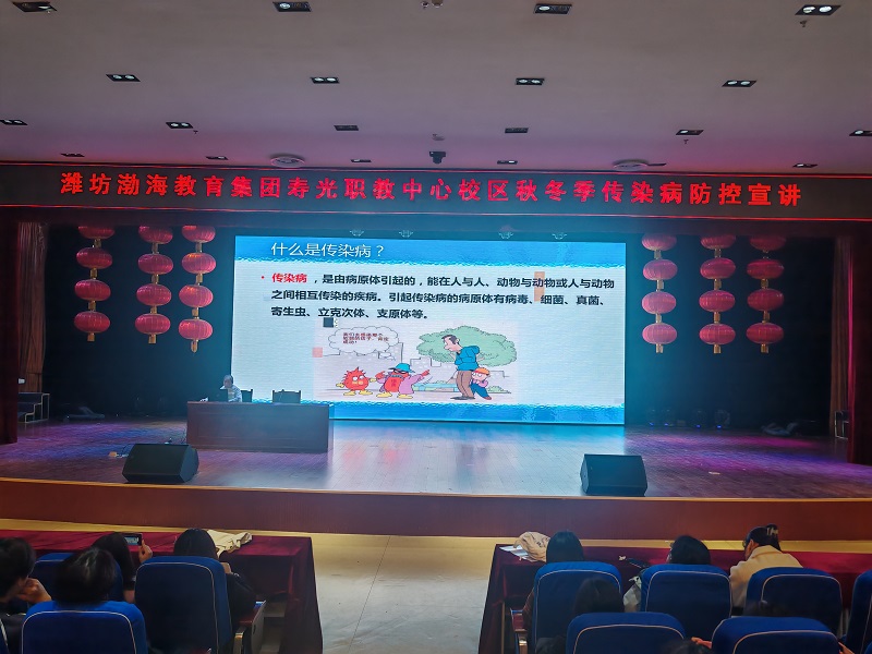 随着秋冬季节的来临,各类呼吸道、肠道传染病进入高发期。为筑牢校园健康屏障,提升师生传染病防控能力,10月31日,潍坊渤海教育集团寿光职教中心校区联合寿光市疾病预防控制中心共同举办秋冬季常见传染病防控专题宣讲活动,1000余名师生参加。