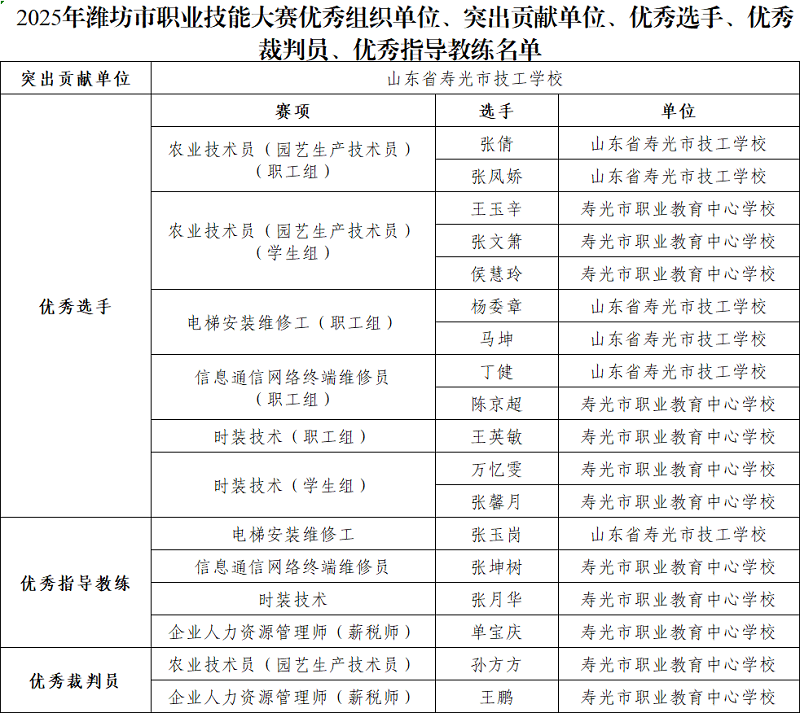 近日,潍坊市职业技能大赛组委会办公室公布了“才聚潍坊·技能兴潍”第五届(2025年)潍坊市职业技能大赛优秀组织单位、突出贡献单位、优秀选手、优秀指导教练和优秀裁判员名单,山东省寿光市技工学校被评为“突出贡献单位”,张倩等老师被评为职工组“优秀选手”,王玉辛等同学被评为学生组“优秀选手”,张坤树等老师被评为“优秀指导教练”,孙方方等老师被评为“优秀裁判员”。