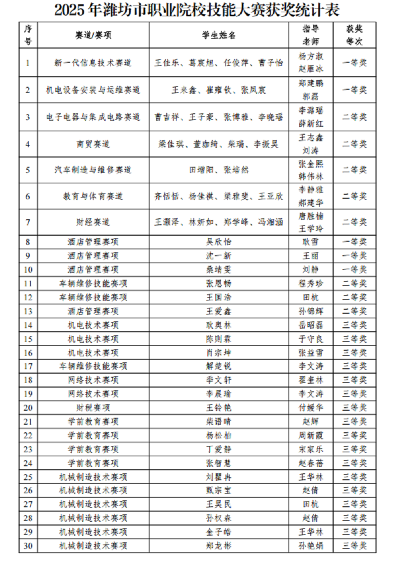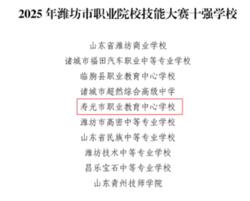 近日,2025年潍坊市职业院校技能大赛获奖名单公布,寿光市职业教育中心学校(山东省寿光市技工学校)共参加了新一代信息技术、机电设备安装与运维等7个赛道以及酒店管理、车辆维修技能等7个赛项的比赛,共有48名学生获奖,其中一等奖5项、二等奖8项、三等奖17项。学校连续13年获“潍坊市职业院校技能大赛十强学校”称号。